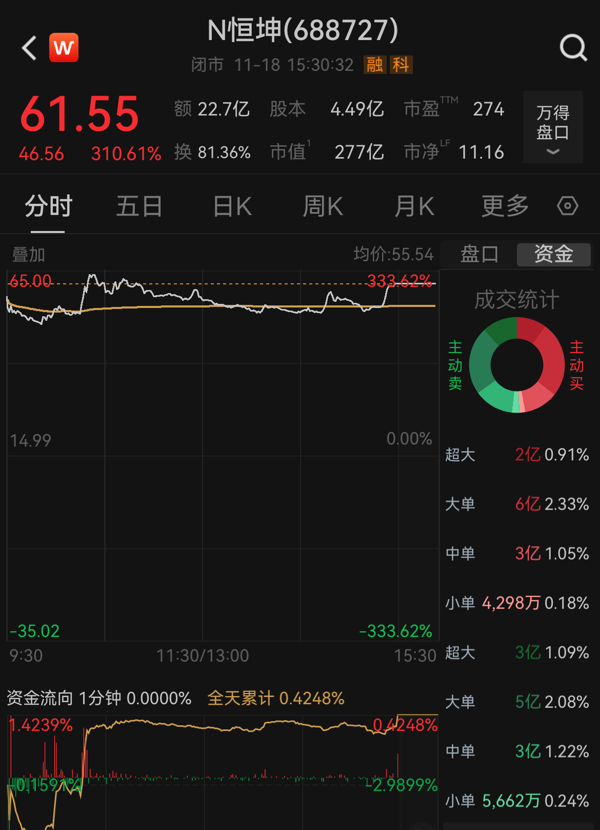 到收盘,恒坤新材股价报61.55元/股,涨幅310.61%,最新总市值277亿元。